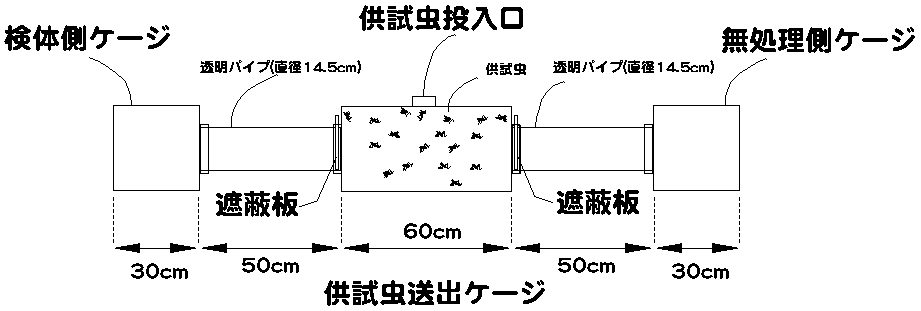 香りが強すぎる検体(サンプル)の場合は、吸血対象まで距離を設けて、「嫌いな香りがあっても吸血に行くのか、忌避剤があるために吸血に行くのをやめるのか」を判定する装置にして、忌避効果を判定します。左右のケージに到達して進入する数(進入数)と吸血数を指標として、忌避率を算出します。アクリルパイプを使用した試験動画もYouTubeにあります。